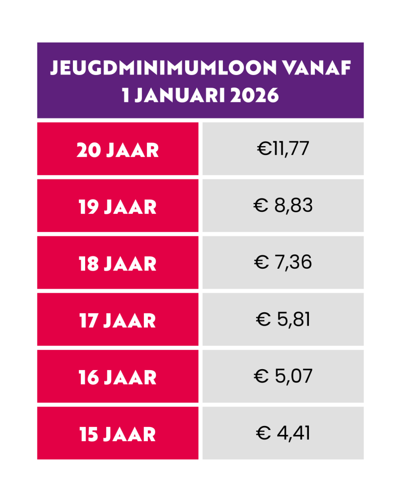 Het minimumjeugdloon is het loon dat werknemers tussen de 15 en 21 jaar minimaal moeten krijgen. Dit loon is een percentage van het volwassen minimumloon en stijgt naarmate je ouder wordt. Vanaf januari 2026 zijn de bedragen per uur als volgt: